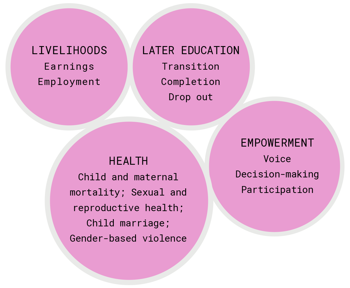 Evidence shows that education enables more education and improves outcomes in health, empowerment and livelihoods. Girls’ education has additional social and intergenerational benefits. Girls in most low and middle income countries are equal to or ahead of boys in early childhood and primary school outcomes but by adolescence, they fall behind in secondary school completion as well as health, household decision-making, and labor market outcomes.